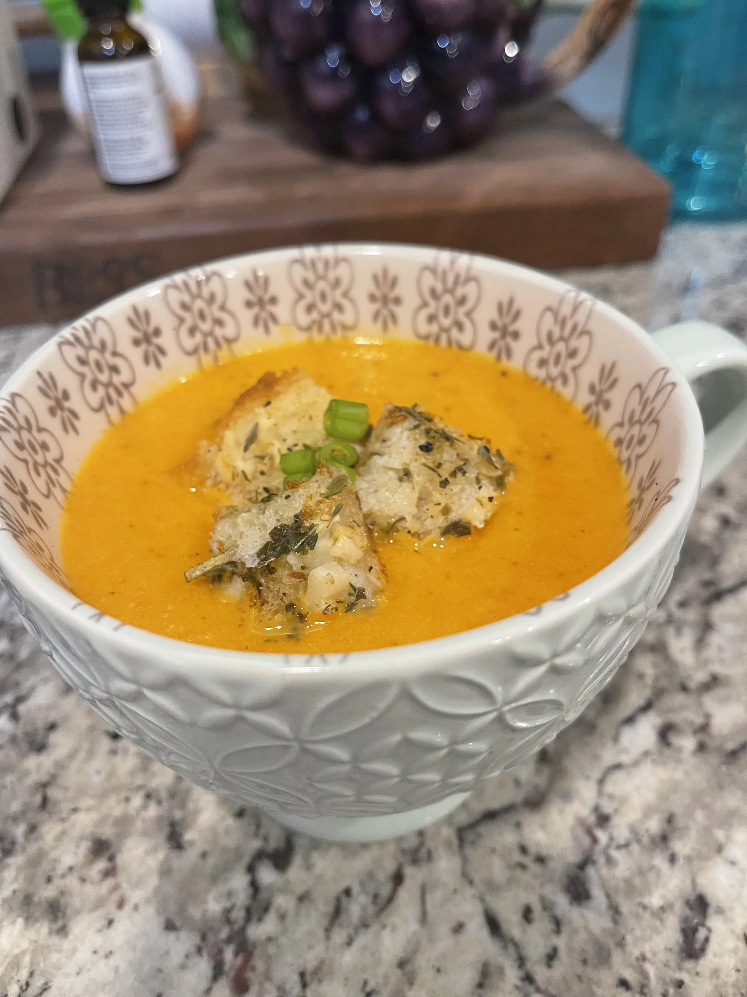 Ladle the soup into a bowl and top with chives. I also like to toast up come garlic bread and chop it into croutons for a nice crunch to balance out the creamy texture of the soup.